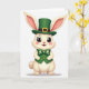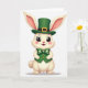 This card shows an anthropomorphic rabbit standing front-facing on a bright white background, dressed in rich shades of green for St. Patrick’s Day 💚. The bunny’s creamy fur looks soft against an emerald top hat with a dark band and a small golden buckle that glints like metal. A deep green vest sits neatly on its chest, fastened with round gold buttons, giving the character a dressed-up, date-night kind of charm. Under the vest, a plump bow tie features little white shamrock shapes, adding a sweet, “I dressed up for you” touch ☘️. The rabbit’s big dark eyes and rosy cheeks read like a fond, friendly gaze, and its small smile feels inviting, as if it’s posing for someone just off to the side. Text is placed above the character in a medium green color, with smaller gold lettering below the hat brim area to balance the layout. The inner ears are soft pink, and the tiny nose sits centered above a gentle curved mouth.