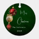 A rustic green uneven colored gradient background. Decorated with red and gold baubles. Personalize and add your name, year. Text: Merry Christmas