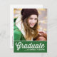 Announce your graduation to family and friends with this customizable class of 2023 graduation postcard. It features a white retro script typography on a green background. Personalize this green graduation announcement postcard by adding your photo, name and school name. This photo graduation announcement postcard is perfect for high school or college graduations.