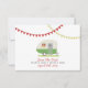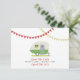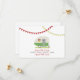 A wedding save the date featuring an illustration of a vintage inspired green trailer parked on green grass. Trailer has a window box full of colorful daisies and black eyed susans. Yellow and red bunting at top. Look for matching wedding invitations and more at Jill's Paperie.