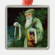 Ornament of Santa Claus dressed in green and carrying a pine tree. Vintage Christmas postcard image.