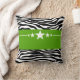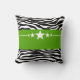 Trendy and modern Sassy Star Zebra Pillow featuring a chic black and white zebra print background and a bold chartreuse green border adorned with a fun star motif. This girly design may be customized with the personalized text of your choosing. Click "Customize It" to find more personalization options.