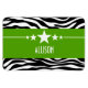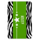 Trendy and modern Sassy Star Zebra Premium Magnet featuring a chic black and white zebra print background and a bold chartreuse green border adorned with a fun star motif. This girly design may be customized with the personalized text of your choosing. Click "Customize It" to find more personalization options.