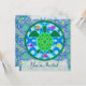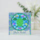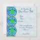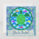 Custom two-sided invitation cards. Front has customizable "You're Invited". Back has invitation information--enter your event title, date, time, location, and a personal message. A green sea turtle with patterned shell, against a blue water/wave pattern, with several colorful fish. Circular design with a green border.