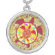 Sea turtle within sea turtle in red / orange / yellow colors. Sea turtle with a design of a smaller turtle, and multiple colorful fish against patterned background.