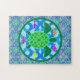 A green sea turtle with patterned shell, against a blue water/wave pattern, with several colorful fish. Circular design with a green border. Sea turtle art.