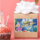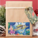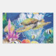 Silk painting of a green sea turtle and friends. Little gold fish, angel fish and others share the sea with colorful seaweeds and corals. Fun and bright for aquariums, gift shops, gifts and cards.