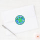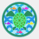 A green sea turtle with patterned shell, against a blue water/wave pattern, with several colorful fish. Circular design with a green border. Sea turtle art.