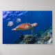 Green Sea Turtle swimming with two Batfish over reef in Sipadan Island, Malaysia