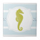 This ceramic tile has a nautical theme with soft blue chunky stripes in the background with a rope design in the middle. Centered is a white frame with a green seahorse silhouette. Some design elements are copyright Graphic Market