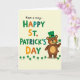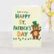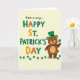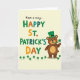 This greeting card shows a creamy background with a sweet brown bear on the right, wearing a bright green leprechaun hat with a small gold buckle and holding a fresh shamrock gently in its mouth 💚. The bear’s soft eyes and slight smile suggest it’s sharing a quiet, friendly moment, like a small gesture you’d save for someone you care about. On the left and center, the message reads “Have a very… HAPPY ST. PATRICK’S DAY,” arranged in stacked lines that fill most of the open space. The lettering is rounded and easy to read, with words alternating in greens, oranges, and teal for a cheerful mix without feeling busy ☘️. “HAPPY ST. PATRICK’S DAY” appears larger than the rest, drawing attention toward the middle of the layout. Near the bottom, a thin row of small green shamrocks runs horizontally like a simple border. The shamrock stem in the bear’s mouth curls slightly upward, and the hat tilts neatly above its rounded ears. Share your St. Patrick's Day sentiments.