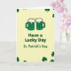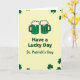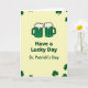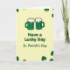 Designed with two emerald-green beer mugs clinking near the upper center, the artwork suggests an easy closeness, like friends leaning in for a shared toast 💚. Each mug is topped with a thick, frothy white cap that spills slightly above the rim, making the drinks look fresh and inviting. The mugs are outlined in dark green with simple, graphic shapes that keep the focus on the cheerful clink. Below the illustration, the phrase “Have a Lucky Day” appears in green, centered and easy to read. Directly underneath, “St. Patrick’s Day” is also centered in matching green, forming a tidy stacked layout. The background is a soft, creamy yellow that warms the scene and makes the green elements stand out. Dark green shamrock shapes are scattered around the page like confetti, adding a gentle ☘️ border-like frame without crowding the main image. The shamrocks vary in placement across the creamy yellow field, with several floating near the corners and edges.