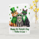 This greeting card shows three dressed-up cats celebrating St. Patrick’s Day on a bright white background sprinkled with small green shamrocks 💚. In the middle, an orange tabby in a ribbed green sweater wears a leprechaun hat with a shamrock buckle, its big green eyes turned toward its friends with a soft, welcoming look. Beside it stands a grey cat in cool green sunglasses, a shiny green heart pendant resting on its chest like a quiet sign of affection. On the other side, a black cat wears a green tuxedo with a white shirt and a neatly tied green bowtie, leaning in as if part of the group’s close-knit camaraderie ☘️. The lighting is even and bright, making the emerald and lime tones stand out across the outfits and accessories. Across the front, the message “Happy St. Patrick’s Day Father in Law” appears in green, set prominently so it reads clearly against the white space. The shamrocks are scattered around the trio, framing them without crowding the open background.