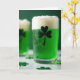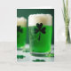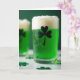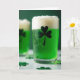 This card shows a close-up of a tall glass filled with bright green drink, topped with a thick, cloudlike foam that looks soft enough to share. Tiny bubbles cling to the inside of the glass, and a dark shamrock emblem sits on the front like a small badge of luck ☘️. Just behind it, a second green drink appears slightly out of focus, like a friend leaning in for a quiet toast. The background is deep forest green, making the glowing drink stand out and giving the scene a cozy, evening feel 💚. Along the bottom, on a pale surface with light texture, scattered dark green shamrock confetti adds a festive touch without stealing attention. The greeting text is placed near the top in a light, easy-to-read color that contrasts against the dark backdrop. The foam catches the warm light in gentle highlights, and the dark shamrock shapes on the table sit near the base of both glasses.