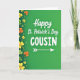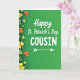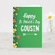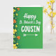This card features a smooth gradient background shifting from deep emerald to bright lime green, with softer edges that frame the center. Along the left side, a drifting border of shamrocks and four-leaf clovers climbs upward, with a few scattered across the top and bottom for extra motion ☘️. The clovers appear in sunny yellow, warm orange, and several greens, each with light shading that makes them look slightly raised. In the middle, the main message sits in white, reading “Happy St. Patrick’s Day” on the upper lines, with “COUSIN” placed just below in larger, all-cap letters. The white lettering is helped by a faint shadow so it stands out against the green, like a friendly note meant to be noticed right away 💚. Beneath the words, a slim white arrow points to the right, adding a gentle sense of direction, like an inviting nudge from one family member to another. The overall layout keeps the clovers to the side while the centered text and arrow stay crisp and bright against the green field.