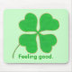 Painting of a bright green shamrock, four leaf clover, trimmed in gold dots, with the affirmation, Feeling good, printed on mouse pads. Can easily be customized with your own message on the template form.