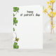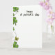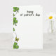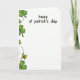 This greeting card features a bright white background with a vertical trail of green shamrocks running down the left edge, like a gentle border that leans inward. The shamrocks shift through a few green tones with darker outlines, and dotted lines curve between them as if they’re guiding a shared path. Near the middle-left, a small yellow butterfly with spiral details on its wings follows one dotted trail, adding a sweet, fluttering touch beside the clovers ☘️. In the upper right, the phrase “happy st patrick’s day” sits in a friendly, casual sans-serif look, printed in a very dark gray that stands out clearly on the white space. The roomy layout leaves lots of open area, making the shamrocks and butterfly feel like they’re drifting toward the greeting together, like close friends walking side by side 💚. The green border stays to the left while the message remains to the right, creating a calm balance across the page. The butterfly’s sunny yellow sits against the greens and white, with dotted arcs curving softly toward the center.