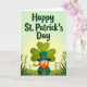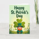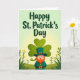 This greeting card features a cheerful leprechaun filling the lower half, dressed in rich green with shiny gold buckles and a thick orange-red beard that curls around his smiling face 💚. His rosy cheeks and bright eyes give him a friendly, almost flirty warmth, as if he’s sharing a private joke with someone just off to the side. Behind him, a huge shamrock rises like a glowing backdrop, setting a festive scene that feels cozy and inviting. The background shifts from soft spring green into a gentle golden light, like sunlight spilling in from behind the clover. Near the top, the words “Happy St. Patrick’s Day” sit prominently in rounded lettering, colored deep emerald so they stand out against the lighter sky. Along the bottom edges, stylized leafy plants and small round yellow berries frame the scene, adding little sparks of color beside the leprechaun’s boots ☘️. The leprechaun is centered in front of the oversized shamrock, with the foliage curving upward at the corners and the emerald greeting arched above.