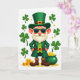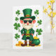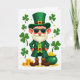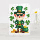 This card shows a charming leprechaun centered on a bright white background, dressed head to toe in emerald green with a tall top hat topped by a shiny gold buckle. He wears green-framed sunglasses that add a modern twist, while his full white beard, rosy cheeks, and friendly smile give him an approachable, companionable look that feels like a wink shared with someone close 💚. Around him, small three-leaf shamrocks float in the open space, their deep green tones echoing his coat and hat ☘️. Near the bottom, stacks of gold coins sit beside a rounded green pot that looks heavy with treasure. The lighting is even and bright, making the outlines sharp and the colors look rich without any shadows crowding the scene. A short St. Patrick’s Day greeting appears near the top in green lettering, with smaller words beneath it in gold to match the hat buckle and coins. Shamrocks drift along the sides, framing the leprechaun above the coin stacks and the overflowing pot of gold.