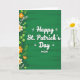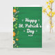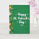 Designed with a rich emerald green background, this St. Patrick’s Day card uses soft horizontal brush marks to give the color a textured, painted look. Along the left edge, a slim garden border of cream and soft orange flowers with bright yellow centers leans inward, surrounded by layered green leaves and scattered shamrocks ☘️. The main greeting sits on the right side in large, flowing white lettering, reading “Happy St. Patrick’s Day + Mom,” with small plus signs acting like gentle pauses between the words. The bright white text stands out against the deep green, like a note meant to be read up close with a fond smile 💚. The floral strip feels like it’s reaching toward the message, adding a cozy, affectionate closeness without crowding the space. Warm orange petals and creamy blooms soften the sea of green, while the shamrocks echo the holiday theme in a simple, classic way. The layout leaves the left border dense with foliage and the right two-thirds open for the white greeting, with the blossoms stacked vertically from top to bottom.