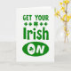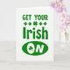 This greeting card centers the phrase “GET YOUR Irish ON” on a bright white background, using a strong emerald-green type that feels upbeat and inviting. “GET YOUR” sits at the top in green, like the start of a toast you’d share with a close friend 💚. Beneath it, five neat shamrocks line up in a row, adding a gentle, lucky rhythm that feels like a friendly nudge or a flirty wink ☘️. The word “Irish” appears larger in the middle, drawing the eye the way you’d linger on someone’s smile across a crowded room. At the bottom, “ON” is placed inside a long green oval that anchors the layout and keeps everything tidy. The letters inside the oval are white, and the “O” is replaced by an upside-down shamrock shape cut out in white, creating a crisp negative-space detail. The overall look stays simple and balanced, with all the green elements centered and evenly spaced on the white field. The five shamrocks form a straight horizontal line between “GET YOUR” and “Irish,” while the green oval sits directly below, stretching wider than the word above.