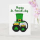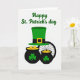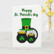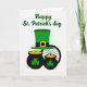 This card features a St. Patrick’s Day scene set on a bright white background, with an emerald green leprechaun hat standing tall at the top like a cheerful centerpiece 💚. The hat has a black band and a square gold buckle, and its polished shine pairs nicely with the warm glow of the coins below. Under the hat sit two matte-black cauldrons, close together as if they’ve been placed side by side by friends sharing a lucky find ☘️. The larger pot on the left spills a stream of gold coins over its rim, while the smaller pot on the right holds a neat pile that looks ready to be scooped up. Each cauldron shows a green shamrock emblem on its front, adding a bright pop of color against the dark metal. Above the illustration, the words “Happy St. Patrick’s day” appear in green lettering, centered and spaced to float over the hat and pots. Behind the right cauldron, a partial black wheel with slender spokes peeks out from the edge, suggesting a hidden cart just out of view.