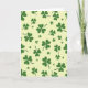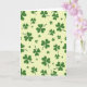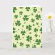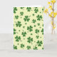 This greeting card features a pale, buttery yellow background sprinkled with green shamrocks that drift in different sizes and angles, like they’re floating in a calm spring breeze ☘️. Each three-leaf clover has gentle shading on the heart-shaped leaves, giving them a soft, rounded look that feels tender and close, like two friends leaning in for a quiet laugh 💚. Between the larger clovers, tiny green shapes—part flower, part new leaf—add little pauses in the pattern so your eyes keep wandering. The layout avoids strict repetition, so the scene feels relaxed and natural, with plenty of open space to let the greens stand out. A short St. Patrick’s Day message sits centered near the top in medium green, with a smaller line beneath it in a lighter green for a layered look. The text is easy to spot without overpowering the pattern, as if it’s gently resting on the background. The shamrocks are scattered across the full front, with a few turned sideways and a few angled upward, creating a light, floating field of clover shapes.