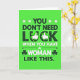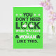This card features the big line “YOU DON’T NEED LUCK WHEN YOU HAVE A WOMAN LIKE THIS” centered on a bright lime green background, with dark green letters and a few white words for emphasis 💚. The phrase fills most of the front, giving it the feel of a confident shout across the page, like a friend bragging about someone they adore. A glowing green outline around the lettering makes each word stand out, as if the message is lit from behind. The word “LUCK” gets special treatment: the “U” turns into a horseshoe shape, dotted with tiny white marks that resemble nail heads. Around the “C” and “K,” green shamrocks appear, each topped with a white thumbs-up hand, like a supportive nod to the woman being praised ☘️. Near “WOMAN,” small shamrock shapes and star accents sit to the sides, adding extra decoration without crowding the main line. The entire layout stays centered and tightly arranged, with the dark green and white text floating over the lime field alongside the horseshoe, shamrocks, thumbs-up icons, and scattered star details.