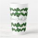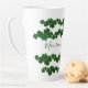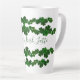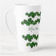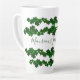 Green shamrocks tall latté mug with personalization. Rows of green clover around the mug, with space in the center for short saying. Sample text reads, "Maureen's Irish Latté". Personalize with a name using modern, hand-written font in dark green.
