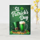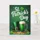 This design shows a St. Patrick’s Day scene washed in emerald and forest greens, with a gentle golden sparkle drifting near the top like tiny flecks of light. Across the upper portion, “St. Patrick’s Day” appears in large white lettering, centered and easy to spot against the dark green background. On the left sits a deep green leprechaun hat with a satin-like sheen, its gold buckle catching the light as if someone just set it down for a toast. To the right, a tall clear mug holds shimmering green drink topped with pale-green foam, the glass reflections making it feel freshly poured and ready to clink with a friend 💚. Along the bottom, gold coins spill forward in a loose trail, as though they’ve tumbled out during a close, laughing moment. Between the coins, plump shamrocks dot the surface, adding little pauses of green-on-green detail ☘️. The foreground is packed with gleaming coins, clustered shamrocks, the angled hat brim, and the bright buckle beside the clear mug and its frothy top.