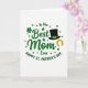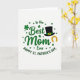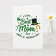 This greeting card features the message “to the Best Mom Ever” centered in deep emerald green, with gently wavy lettering that feels affectionate and close. Curving beneath it, “HAPPY ST. PATRICK’S DAY” appears in smaller green text, arched to echo the main line and guide the eye in a neat circle. A tiny black top hat with a green band and a gold buckle perches at an angle on the “M” in “Mom,” like a teasing little wink between family members. Nearby, a shiny gold horseshoe sits upright, adding a warm glint against the white background and pairing nicely with the green text 💚. Around the words, shamrocks in several sizes are sprinkled like confetti, making the space feel lively without crowding the message ☘️. The greens range from darker outlines to lighter inner tones, giving the letters a soft sense of depth. The overall layout stays centered and open, with plenty of white space framing the design. Small shamrocks dot the corners and edges, while the hat and horseshoe sit close to the main text for a balanced, festive look.