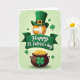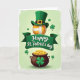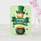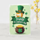 This card features a vertical stack of St. Patrick’s Day icons on a soft green gradient background, with tiny shamrocks sprinkled around like confetti ☘️. At the top sits an emerald leprechaun hat with a gold buckle, perched on a round sphere striped in orange and white that reads like a friendly face. Across the middle, a forest-green banner stretches horizontally and carries the message “Happy St. Patrick’s day” in white lettering. Below, a stout dark-brown pot overflows with shiny gold coins, and a bright green shamrock emblem is centered on the pot’s front 💚. The gentle shading gives the hat, banner, and coins a rounded look, like they’re close enough to touch. The stacked layout feels like a cheerful little totem, with the banner tying the top and bottom together like a friendly arm around the scene. Small shamrocks dot the background in varying sizes, floating around the central stack against the pale green glow.