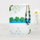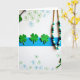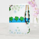 This card shows three rich green shamrock cutouts lined up across a horizontal cerulean-blue band that runs through the middle of a bright white background ☘️. The shamrocks sit close together like friends leaning in for a photo, their matte finish standing out against the smooth paper. Above and below the blue band, simple flower outlines scatter across the white space in spring green and light azure, adding gentle motion without crowding the layout. A short St. Patrick’s Day greeting appears centered on the blue band in crisp white lettering, with smaller matching text tucked near the lower edge in light green. From the upper right corner, a gold cord drapes down with glossy beads in turquoise, black, and white, like a keepsake bracelet slipping into view 💚. The mix of matte shamrocks, airy doodled flowers, and polished beads creates a soft contrast that feels like an easy, affectionate celebration between close pals. The beads hang diagonally toward the center, with the turquoise spheres catching the eye first against the white field.