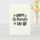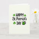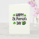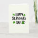On the front of the card the phrase “HAPPY St. Patrick’s DAY” sits centered on a soft off-white background, set in rounded black sans‑serif letters that feel friendly and easy to read. “HAPPY” appears at the top, “St. Patrick’s” is tucked neatly in the middle line, and “DAY” anchors the bottom, creating a balanced stack. Small green shamrocks sit near “HAPPY” and “DAY,” like little lucky notes passed between friends 💚. Their bright green stands out against the black lettering, adding a gentle rhythm around the words. Below the text, an emerald-green beer mug leans into the layout with a thick white foam cap, suggesting a shared toast ☘️. The matching greens of the shamrocks and mug tie the whole scene together, while the open background keeps everything crisp and focused. The foam is drawn in rounded white shapes above the mug’s green body, with the handle clearly visible on one side.