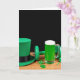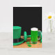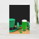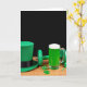 Designed with a warm wooden tabletop and a deep black background, this St. Patrick’s Day scene lines up three green standouts like friends posing close together. On the left sits a soft green top hat with a black ribbon, angled as if it’s leaning in toward the rest of the group. Beside it rests a green dumbbell, adding a cheeky, modern note that feels like a supportive nudge between pals. Center stage is a clear glass mug filled with glowing green drink, topped with a thick cap of white foam that catches the light. Small paper shamrocks are scattered across the front edge, like little tokens dropped during a lively toast ☘️. The greeting “Happy St. Patrick’s Day” appears near the top in bright green lettering, standing out crisply against the dark backdrop 💚. Light skims across the glass and foam and then falls onto the shamrocks, revealing their cut edges and soft shadows on the wood.