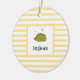 Elegant, modern and cute baby photo round ornament on yellow stripe pattern. This template featuring an adorable illustration of Green baby dinosaur sleeping under the gold yellow stars with custom Baby's name. Great for both baby boy and girl. Perfect gift for all seasons!