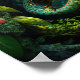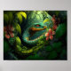 Green snake illustrated in the branches of trees surrounded by v1ibrant tropical flowers in a tropical rainforest.