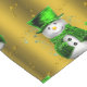 A decorative Christmas table runner featuring a whimsical, colorful pattern of snowmen dressed in green velvet top hat and vest, surrounded by green bows and golden stars all on a golden background to add a unique, designer touch to your Christmas dining and entertaining this holiday season.