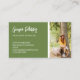 Content creator business card with a charming brush script, maximum green accent color, cute social media icons, and your QR code along with two photos of yourself or your business, one on either side of the double-sided social media business card. Green business card for an influencer personalized with photos, QR code, and contact info.