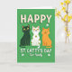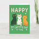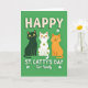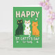 This card shows three stylized cats sitting side by side across the lower middle, their matching smiles and wide yellow eyes giving them the look of close friends posing for a keepsake. A sleek black cat sits on the left, a white cat in the center wears olive-green polka dots like festive freckles, and a warm orange tabby rests on the right, all facing forward with an easy, together-in-this feel 💚. The background is a solid, rich green field that sets a St. Patrick’s Day mood without any extra scenery. Across the upper portion, creamy white all-caps text reads “HAPPY ST. CATTY’S DAY,” spaced to fill the top area. Beneath the trio, smaller white text says “Our Family,” placed low and centered as if tucked right under their paws ☘️. Small white shamrocks are sprinkled around the cats and along the green space, adding little points of decoration. Soft shading and slight drop shadows help the cats and lettering stand out from the flat green backdrop, and the white cat’s green spots remain the standout detail in the middle.