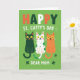 This greeting card features a bright lime green background with the headline “HAPPY ST. CATTY’S DAY” centered near the top in a mix of orange, deep green, and white lettering. Just below, three stylized cats stand close together as if posing for a friendly photo, their shoulders nearly touching in an easy, affectionate way 💚. On the left is a dark green cat, in the middle a white cat dotted with uneven green spots, and on the right a warm orange cat, forming a trio that feels coordinated and cozy. Each cat has wide yellow eyes, a faint pink blush on the cheeks, and a small smile that makes them look gently pleased to be side by side. Their bodies are tall and simple with curled tails, keeping the scene light and tidy while drawing attention to their faces. Near the bottom, “DEAR MOM” appears in dark green text, framed by small dark green shamrocks on either side ☘️. The shamrocks sit low along the bottom edge, echoing the green theme while the cats remain the main focus in the center.