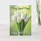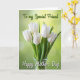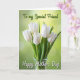 This card features a bouquet of white, bell-shaped flowers arranged in a clear glass vase, their smooth petals curling softly as if leaning close like old friends. The fresh green stems rise together in a gentle cluster, creating a calm, romantic kind of closeness without any extra fuss ❤️. Behind them, the background fades through spring greens, shifting from light lime near the top to deeper emerald tones toward the edges. A soft, out-of-focus glow adds depth, like sunlight filtering through leaves on a quiet morning 🌼. Light falls across the blossoms to highlight their rounded edges and the crisp, newly cut look of the stems. Near the top, a short line of text sits in bright green lettering, and below it a second line appears in flowing white lettering. The vase is centered near the bottom, with the stems visible through the glass against the green gradient.