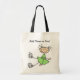 A stick figure girl ice skater wearing a green dress on a tote bag you can easily customize with a name or other text before ordering.