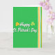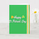 This St. Patrick's Day card features an emerald-green background that sets a festive scene right away 💚. Centered on the front, the phrase “Happy St. Patrick’s Day” appears in flowing white lettering with a soft shadow that helps it stand out from the green. A small golden-orange shamrock sits beside the word “Happy,” like a friendly little gift tucked into the greeting ☘️. Another lighter green shamrock is worked into “Patrick’s,” adding a gentle accent that feels like a quiet nod between close friends. On the right side, three vertical stripes in green, white, and orange form an Irish flag motif, balancing the main text. The stripe edges look slightly uneven, giving the design a relaxed, human touch rather than sharp precision. The layout keeps the message centered while the flag detail stays to the right, with the shamrocks sprinkled near the words for extra charm. The green field, white lettering, orange shamrock, and right-side tricolor stripes create a bright, celebratory look with clear contrast and simple shapes.