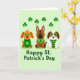 This card shows three cartoon dogs lined up across a pale green background, leaning slightly toward one another like close friends posing for a photo 💚. On the left, an orange pup wears green glasses and a green sweater with a shamrock on the chest, giving it a bright, attentive look. In the middle, a brown dog stands snugly between the others with a green bandana featuring a four-leaf clover, its calm expression adding a gentle, affectionate touch to the group. On the right, a white-and-brown spotted pup wears green glasses and an emerald striped sweater, angled in a way that feels companionable and cozy ☘️. Above their heads, six small shamrocks float in a loose row, spaced evenly to frame the trio. Beneath the dogs, the phrase “Happy St. Patrick’s Day” appears centered in dark green lettering, sitting just under their paws. The green accents repeat across the glasses, clothing, and clover details, tying the characters together against the soft green field. The final detail is the neat cluster of shamrocks hovering above the dogs while the dark green greeting sits centered below them.