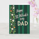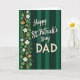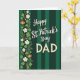 This card features a tall layout split between a leafy border on the left and green striped panels on the right, setting a festive St. Patrick’s Day scene ☘️. Along the left edge, curling vines climb upward with creamy white daisies, tiny white blossoms, and clusters of soft olive three-leaf clovers. Near the middle of that border, a lotus-like bloom in orange and golden yellow adds a bright contrast, like a little surprise tucked into the greenery 💚. On the right side, the background alternates vertical bands of deep emerald and forest green, giving the message area a structured look. “Happy St. Patrick’s Day” sits prominently toward the upper right in creamy white lettering, standing out clearly against the darker greens. Beneath it, “DAD” appears larger and lower, with each letter filled with small golden-yellow dots that resemble tiny marquee bulbs, like a spotlighted nod of affection. The overall composition keeps the flowers and clovers hugging the left margin while the white greeting and glowing dotted letters command the right side against the striped green field.