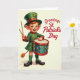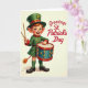 This card shows a leprechaun-like drummer stepping forward on the left, dressed in emerald green with gold buttons and red cuffs, as if striding toward a friend with an eager grin 💚. Rosy cheeks, wide green eyes, and an open smile sit beneath fiery auburn hair and pointed ears, giving the character a bright, welcoming look. A tall green top hat with a gold buckle and a four-leaf clover adds a lucky touch ☘️. One hand lifts wooden drumsticks in the air while the other steadies an ornate teal drum trimmed with a red rim and small gold details. A fox-like tail peeks from beneath the tunic, adding a soft, storybook twist to the scene. The background is a warm cream with gentle texture, keeping the focus on the figure and its lively pose. On the right side, the phrase “Greetings St. Patrick’s Day” appears in elegant red lettering, sized large and set against the open space. The drum’s teal body, red edging, and gold accents sit clearly in the foreground beside the character’s raised sticks.
