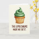 This greeting card features a single cupcake centered on an off-white background, keeping the focus on its sweet St. Patrick’s Day look. The frosting rises in a tall swirl of emerald green with gentle highlights and shaded ridges that make it look creamy, topped with a small curl at the peak 💚. Below it, the cake shows as a warm golden-brown dome tucked into a fluted ochre wrapper with visible folds and a lightly brushed texture. The cupcake sits alone, like it’s waiting to be shared after a laugh with a close friend over who really made the snack disappear ☘️. Along the lower portion of the card, the phrase “THE LEPRECHAUNS MADE ME EAT IT” is set in a casual, hand-drawn style. The letters are deep earthy brown, stretching across the bottom area beneath the cupcake and balancing the warm tones of the wrapper. The background remains plain and soft, with no extra objects, so the green frosting and brown text stand out clearly.