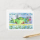 A pretty postcard featuring a teatime setting with a green teapot, steaming cup, a tea tin, green tea leaves along the bottom, and jasmine flowers along the top drawn with ink and painted with watercolor. Really nice for postcard exchanges, pen pals, and sending a thinking of you note to someone special. It's nice to get something colorful and kind in the mail!