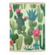 This is a pattern of decorative green and teal flowering cacti on a light greenery background.